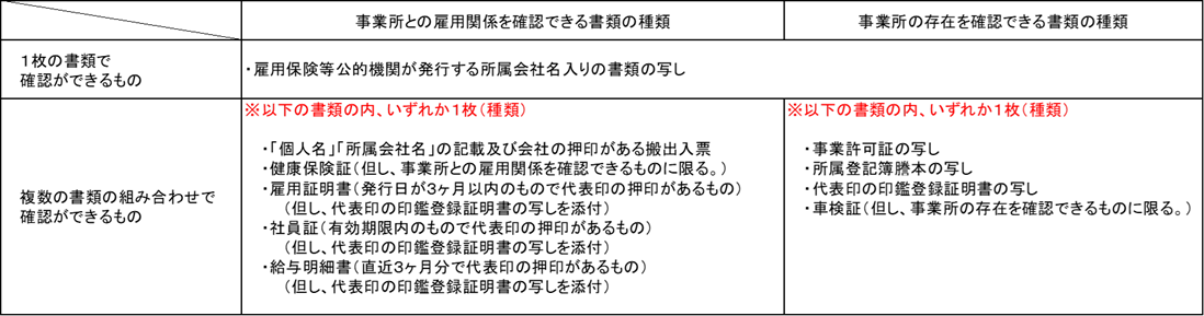 ③事業所の雇用関係及び事業所の存在を確認出来る書類(下表のとおり)